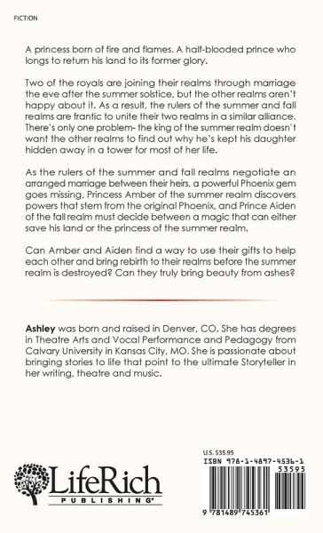 A princess born of fire and flames. A half-blooded prince who longs to return his land to its former glory. Two of the royals are joining their realms through marriage the eve after the summer solstice, but the other realms aren't happy about it. As a result, the rulers of the summer and fall realms are frantic to unite their two realms in a similar alliance. There's only one problem- the king of the summer realm doesn't want the other realms to find out why he's kept his daughter hidden away in a tower for most of her life. As the rulers of the summer and fall realms negotiate an arranged marriage between their heirs, a powerful Phoenix gem goes missing, Princess Amber of the summer realm discovers powers that stem from the original Phoenix, and Prince Aiden of the fall realm must decide between a magic that can either save his land or the princess of the summer realm. Can Amber and Aiden find a way to use their gifts to help each other and bring rebirth to their realms before the summer realm is destroyed? Can they truly bring beauty from ashes?