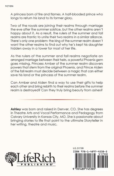 A princess born of fire and flames. A half-blooded prince who longs to return his land to its former glory. Two of the royals are joining their realms through marriage the eve after the summer solstice, but the other realms aren't happy about it. As a result, the rulers of the summer and fall realms are frantic to unite their two realms in a similar alliance. There's only one problem- the king of the summer realm doesn't want the other realms to find out why he's kept his daughter hidden away in a tower for most of her life. As the rulers of the summer and fall realms negotiate an arranged marriage between their heirs, a powerful Phoenix gem goes missing, Princess Amber of the summer realm discovers powers that stem from the original Phoenix, and Prince Aiden of the fall realm must decide between a magic that can either save his land or the princess of the summer realm. Can Amber and Aiden find a way to use their gifts to help each other and bring rebirth to their realms before the summer realm is destroyed? Can they truly bring beauty from ashes?