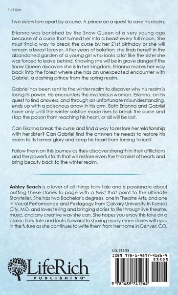 Two sisters torn apart by a curse. A prince on a quest to save his realm. Erianna was banished by the Snow Queen at a very young age because of a curse that turned her into a beast every full moon. She must find a way to break the curse by her 21st birthday or she will remain a beast forever. After years of isolation, she finds herself in the abandoned garden of a young girl who looks a lot like the sister she was forced to leave behind. Knowing she will be in grave danger if the Snow Queen discovers she is in her kingdom, Erianna makes her way back into the forest where she has an unexpected encounter with Gabriel, a dashing prince from the spring realm. Gabriel has been sent to the winter realm to discover why his realm is losing its power. He encounters the mysterious woman, Erianna, on his quest to find answers, and through an unfortunate understanding, ends up with a poisonous arrow in his arm. Both Erianna and Gabriel have only until the winter solstice moon rises to break the curse and stop the poison from reaching his heart, or all will be lost. Can Erianna break the curse and find a way to restore her relationship with her sister? Can Gabriel find the answers he needs to restore his realm to its former glory and keep his heart from turning to ice? Follow them on this journey as they discover strength in their afflictions and the powerful faith that will restore even the thorniest of hearts and bring beauty back to the winter realm.