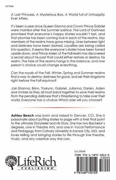 A Lost Princess. A Mysterious Box. A World full of Unhappily Ever Afters. It's been a year since Queen Erianna and Crown Prince Gabriel were married after the Summer solstice. The Lord of Darkness promised that everyone's happy stories wouldn't last, and that promise has been coming true in each of the realms. Key members of the realms have gone missing. Lines between light and darkness have been blurred. Loyalties are being called into question. It seems like everyone's stories have been turned upside down, and Prince Aiden of the Fall realm has discovered a secret about his past that could either restore or destroy his realm. The fate of the realms hang in the balance, and one person's choice could change everything. Can the royals of the Fall, Winter, Spring and Summer realms find a way to destroy darkness for good, and set their kingdoms right before the Fall equinox? Join Erianna, Brinn, Gabriel, Julianna, Darien, Aiden and Amber as they all must band together to save their realms from the pending darkness that's threatening to take over their world. Everyone has a choice-Which side will you choose?