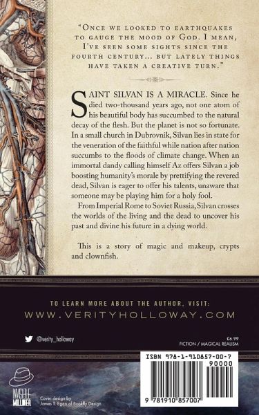 Saint Silvan is a miracle. Since he died two-thousand years ago, not one atom of his beautiful body has succumbed to the natural decay of the flesh. But the planet is not so fortunate. In a small church in Dubrovnik, Silvan lies in state for the veneration of the faithful while nation after nation succumbs to the rising tides of climate change. When an immortal dandy calling himself Az offers Silvan a job boosting humanity's morale by prettifying the revered dead, Silvan is eager to offer his talents, unaware that someone may be playing him for a holy fool. From Imperial Rome to Soviet Russia, Silvan crosses the worlds of the living and the dead to uncover his past and divine his future in a dying world. This is a story of magic and makeup, crypts and clownfish.