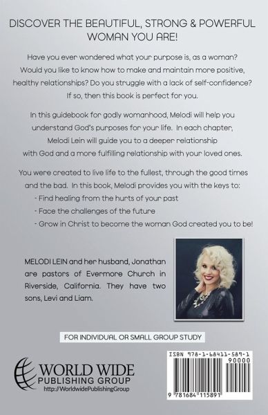 Discover the beautiful, strong and powerful woman you are. Have you ever wondered what your purpose is, as a woman?" Would you like to know how to make and maintain more positive, healthy relationships? Do you struggle with a lack of self-confidence? If so, then this book is perfect for you. In this guidebook for godly womanhood, Melodi will help you understand God's purposes for your life. In each chapter, Melodi Lein will guide you to a deeper relationship with God and a more fulfilling relationship with your loved ones. You were created to live life to the fullest, through the good times and the bad. In this book, Melodi provides you with the keys to: * Find healing from the hurts of your past * Face the challenges of the future * Grow in Christ to become the woman God created you to be! (For individual or small group study)