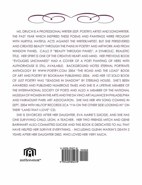 MS. DRUCH IS A PROFESSIONAL WRITER (ESP. POETRY) ARTIST AND SONGWRITER. THE PAST YEAR WHICH INSPIRED THESE POEMS AND PAINTINGS WERE FROUGHT WITH HURTFUL HATEFUL ACTS AGAINST THE WRITER/ARTIST, BUT SHE PERSEVERED AND CREATED BEAUTY THROUGH THE PAINS IN POETRY AND ARTWORK AND FROM WINDOW PANES. CALLS IT "BEAUTY THROUGH PANES", A SYMBOLIC, REALISTIC TITLE. HER SPIRIT IS ONE OF THE CREATIVE HEART AND MIND. HER PREVIOUS BOOK "EVOLIGIES UNCHAINED" HAD A COVER OF A POET PAINTING OF HERS WITH AUTHORHOUSE IS STILL AVAILABLE. BACKGROUND NOTES ETERNAL PORTRAITS ANTHOLOGY BY WWW.POETRY.COM 2004 "THE ROAD AND THE LOAD" BOOK OF ART AND POETRY BY BOOKMAN PUBLISHING 2004. AND HER 1ST SOLO BOOK OF JUST POETRY WAS "SEASONS IN SHADOW" BY STERLING HOUSE. SHE'S BEEN AWARDED AND PUBLISHED NUMEROUS TIMES AND SHE IS A LIFETIME MEMBER OF THE INTERNATIONAL SOCIETY OF POETS AND ALSO A MEMBER OF THE NATIONAL MUSEUM OF WOMEN IN THE ARTS AND THE DA VINCI ART ALLIANCE IN PHILADELPHIA AND FAIRMOUNT PARK ART ASSOCIATION. SHE HAS HER 4TH SONG COMING IN SEPT. 2004 WITH HILLTOP RECORDS SCA "I'M ON THE OTHER SIDE LOOKING IN" ON THEIR "LAND THAT I LOVE" CD. SHE IS DIVORCED AFTER HER DAUGHTER, EVA MARIE'S SUICIDE, AND SHE HAS ONE SURVIVING CHILD, LEON, A TEACHER. HER TWO FRIENDS MITCH AND GENE BARNNART ALSO COMMITTED SUICIDE AND THIS BOOK IS DEDICATED TO ALL THAT HAVE HELPED HER SURVIVE EVERYTHING. - INCLUDING GLENN WATKIN'S DEATH 2 YEARS AFTER HER DAUGHTER DIED, WHO LOVED HER VERY MUCH.