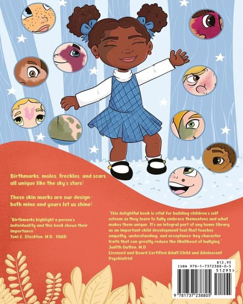 Birthmarks, moles, freckles, and scars are all unique like the sky's stars. "Beauty with a Birthmark" is an integral part of any home library as an important child development tool that teaches empathy, understanding, and acceptance - key character traits that can greatly reduce the likelihood of bullying. This delightful book is vital for building children's self-esteem as they learn to fully embrace themselves and what makes them unique. These skin marks are our design, both mine and yours, let us shine.