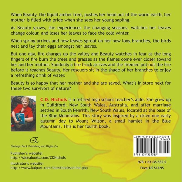 When Beauty, the liquid amber tree, pushes her head out of the warm earth, her mother is filled with pride when she sees her young sapling. As Beauty grows, she experiences the changing seasons, watches her leaves change colour, and loses her leaves to face the cold winter. When spring arrives and new leaves sprout on her now long branches, the birds nest and lay their eggs amongst her leaves. But one day, fire charges up the valley and Beauty watches in fear as the long fingers of fire burn the trees and grasses as the flames come ever closer toward her and her mother. Suddenly a fire truck arrives and the firemen put out the fire before it reaches Beauty. Her rescuers sit in the shade of her branches to enjoy a refreshing drink of water. Beauty is so happy that her mother and she are saved. What's in store next for these two survivors of nature? C.D. Nichols is a retired high school teacher's aide. She grew up in Guildford, New South Wales, Australia, and after marriage settled in South Penrith, New South Wales, located at the base of the Blue Mountains. This story was inspired by a drive one early autumn day to Mount Wilson, a small hamlet in the Blue Mountains. This is her fourth book. Publisher's website: http://sbprabooks.com/CDNichols