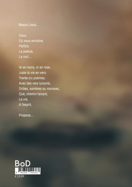Beaux Lieux...Ceux,Où vous entraîne,Parfois, La poésie,La nuit ...Ni en noire, ni en rose, Juste la vie en vers:Trente six poèmes,Avec des vers luisants,Drôles, sombres ou moroses,Que, chemin faisant,La vie,A l'esprit, Propose...
