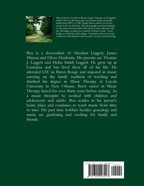 An original record of generations of the Hinson/Smith/Leggett/Ardoin families. Centered at Beaver Creek, Louisiana, and with data and photographs back to the 1800's (genealogical data goes back more) one finds a book in three parts: 1) The Family History, 2) Photographic Record of the family, and 3) Genealogical data presented in narrative form highlighting families and generations. A book to keep for generations, and a starter book for others who wish to know more of the history of their relatedness to the families who married and worked together in and around Beaver Creek, Louisiana (near Oakdale, Louisiana). Written by Ben F. Leggett from Glenmora, La in 2012. When new information is provided to the author, it is possible that future editions will be more extensive.