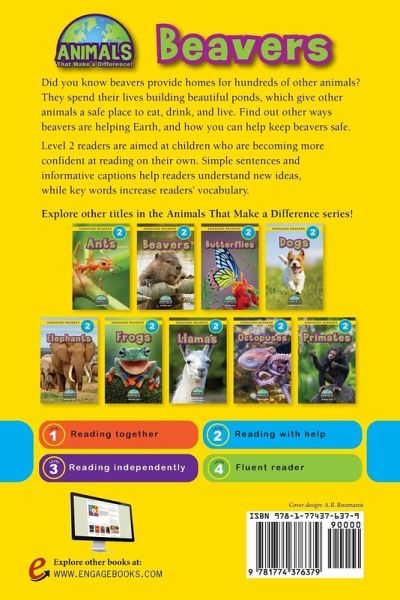 Did you know beavers provide homes for hundreds of other animals? They spend their lives building beautiful ponds, which give other animals a safe place to eat, drink, and live. Find out other ways beavers are helping Earth, and how you can help keep beavers safe. Level 2 readers are aimed at children who are becoming more confident at reading on their own. Simple sentences and informative captions help readers understand new ideas, while key words increase readers' vocabulary.