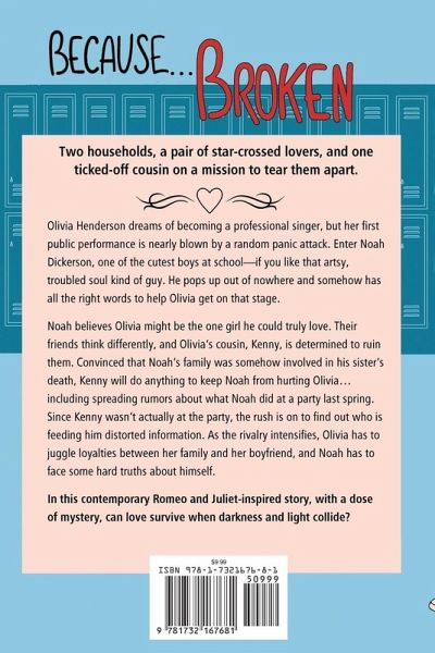 Two households, a pair of star-crossed lovers, and one ticked-off cousin on a mission to tear them apart. Olivia Henderson dreams of becoming a professional singer, but her first public performance is nearly blown by a random panic attack. Enter Noah Dickerson, one of the cutest boys at school--if you like that artsy, troubled soul kind of guy. He pops up out of nowhere and somehow has all the right words to help Olivia get on that stage.Noah believes Olivia might be the one girl he could truly love. Their friends think differently, and Olivia's cousin, Kenny, is determined to ruin them. Convinced that Noah's family was somehow involved in his sister's death, Kenny will do anything to keep Noah from hurting Olivia... including spreading rumors about what Noah did at a party last spring. Since Kenny wasn't actually at the party, the rush is on to find out who is feeding him distorted information. As the rivalry intensifies, Olivia has to juggle loyalties between her family and her boyfriend, and Noah has to face some hard truths about himself. In this contemporary Romeo and Juliet-inspired story, with a dose of mystery, can love survive when darkness and light collide?
