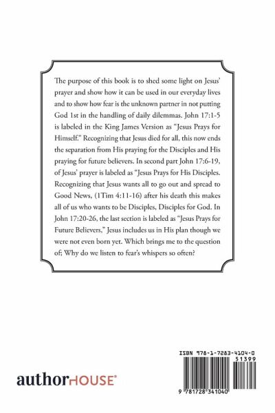 The purpose of this book is to shed some light on Jesus' prayer and show how it can be used in our everyday lives and to show how fear is the unknown partner in not putting God 1st in the handling of daily dilemmas. John 17:1-5 is labeled in the King James Version as "Jesus Prays for Himself." Recognizing that Jesus died for all, this now ends the separation from His praying for the Disciples and His praying for future believers. In second part John 17:6-19, of Jesus' prayer is labeled as "Jesus Prays for His Disciples. Recognizing that Jesus wants all to go out and spread to Good News, (1Tim 4:11-16) after his death this makes all of us who wants to be Disciples, Disciples for God. In John 17:20-26, the last section is labeled as "Jesus Prays for Future Believers," Jesus includes us in His plan though we were not even born yet. Which brings me to the question of; Why do we listen to fear's whispers so often?
