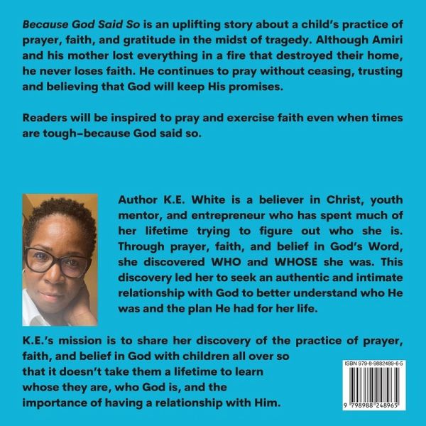 Because God Said So is an uplifting story about a child's practice of prayer, faith, and gratitude in the midst of tragedy. Although Amiri and his mother lost everything in a fire that destroyed their home, he never loses faith. He continues to pray without ceasing, trusting and believing that God will keep His promises. Readers will be inspired to pray and exercise faith even when times are tough-because God said so.