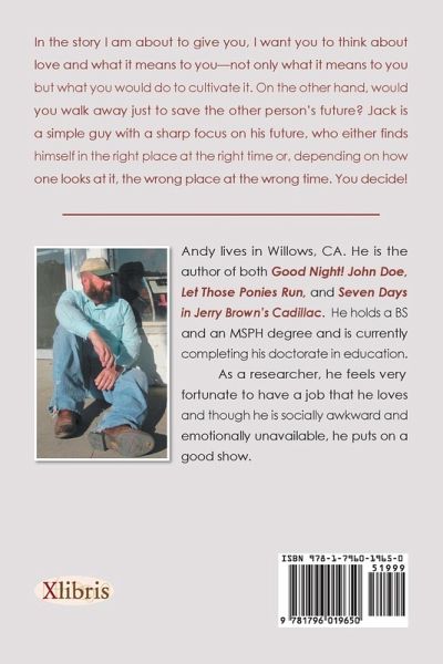 In the story I am about to give you, I want you to think about love and what it means to you-not only what it means to you but what you would do to cultivate it. On the other hand, would you walk away just to save the other person's future? Jack is a simple guy with a sharp focus on his future, who either finds himself in the right place at the right time or, depending on how one looks at it, the wrong place at the wrong time. You decide!