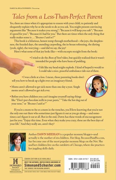 Yes, there are times when it’s appropriate to reason with your child, to patiently and eloquently explain why he or she needs to do as you ask. You might present convincing arguments like “Because it makes you strong”; “Because it will keep you safe”; “Because it’s good for you”; “Because it’s bad for you.” But there are times when the only thing that really makes sense is . . . “Because I said so!!” This book is a hilarious, honest romp through motherhood—the joys, the sleeplessness, the frazzled days, the unending carpooling, the in-house refereeing, the dieting (yeah, right), the worrying—and did we say, the joy? Here’s what some of that joy looks like—with excerpts straight from the book: • I tried to do the Buns of Steel video, but quickly realized that it wasn’t intended for people who have buns of pudding. • I felt like my head might explode. I kind of hoped it would so I could take a nice, peaceful ambulance ride out of there. • I was a little at a loss. I mean, those parenting books don’t tell you how to break up a fight over an imaginary friend. • Moms aren’t allowed to get sick more than one day a year. Single moms aren’t allowed to get sick ever. • Before you have children you can’t imagine yourself saying things like “Don’t put chocolate milk in your pants,” “Take the hot dog out of your nose,” or “Because I said so!” If you’re a mom-to-be or a mom in the trenches, you’ll love knowing that you’re not the only one out there who sometimes just figures it out as you go along—and sometimes can’t figure it out at all. But in the end, Dawn has these words of encouragement just for you: “Enjoy this time. Even when they make you crazy, these are the best days of your life.” And they really are, aren’t they?