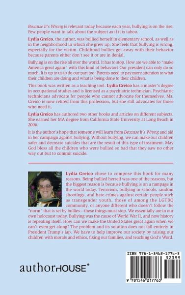 Because Its Wrong is relevant today because each year, bullying is on the rise. Few people want to talk about the subject as if it is taboo. Lydia Greico, the author, was bullied herself in elementary school, as well as in the neighborhood in which she grew up. She feels that bullying is wrong, especially for the victim. Childhood bullies get away with their behavior because parents either dont see it or are in denial. Bullying is on the rise all over the world. It has to stop. How are we able to make America great again with this kind of behavior? Our president can only do so much. It is up to us to do our part too. Parents need to pay more attention to what their children are doing and what is being done to their children. This book was written as a teaching tool. Lydia Greico has a masters degree in occupational studies and is licensed as a psychiatric technician. Psychiatric technicians advocate for people who cannot advocate for themselves. Ms. Greico is now retired from this profession, but she still advocates for those who need it. Lydia Greico has authored two other books and articles on different subjects. She earned her MA degree from California State University at Long Beach in 2006. It is the authors hope that someone will learn from Because Its Wrong and aid in her campaign against bullying. Without bullying, we can make our children safer and decrease suicides that are the result of this type of treatment. May God bless all the children who were bullied so bad that they saw no other way out but to commit suicide.