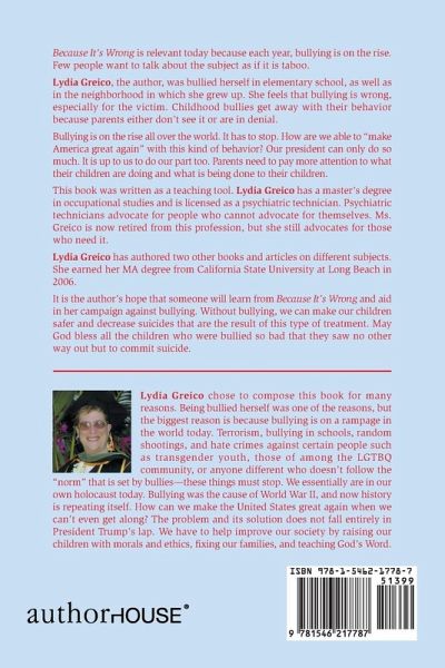 Because Its Wrong is relevant today because each year, bullying is on the rise. Few people want to talk about the subject as if it is taboo. Lydia Greico, the author, was bullied herself in elementary school, as well as in the neighborhood in which she grew up. She feels that bullying is wrong, especially for the victim. Childhood bullies get away with their behavior because parents either dont see it or are in denial. Bullying is on the rise all over the world. It has to stop. How are we able to make America great again with this kind of behavior? Our president can only do so much. It is up to us to do our part too. Parents need to pay more attention to what their children are doing and what is being done to their children. This book was written as a teaching tool. Lydia Greico has a masters degree in occupational studies and is licensed as a psychiatric technician. Psychiatric technicians advocate for people who cannot advocate for themselves. Ms. Greico is now retired from this profession, but she still advocates for those who need it. Lydia Greico has authored two other books and articles on different subjects. She earned her MA degree from California State University at Long Beach in 2006. It is the authors hope that someone will learn from Because Its Wrong and aid in her campaign against bullying. Without bullying, we can make our children safer and decrease suicides that are the result of this type of treatment. May God bless all the children who were bullied so bad that they saw no other way out but to commit suicide.