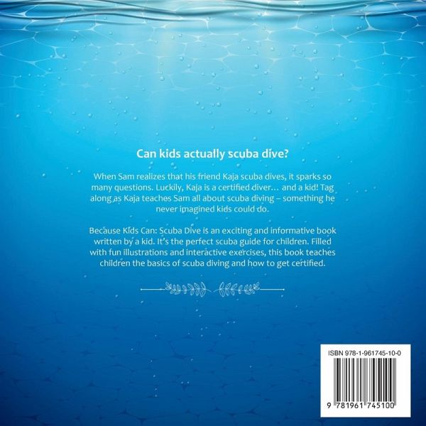 When Sam realizes that his friend Kaja scuba dives, it sparks many questions, kindling an inspirational story for kids. Luckily, Kaja is not just a certified diver but also a kid author! This engaging scuba diving children's book takes us through Kaja's journey as she teaches Sam about scuba diving, a surprising kids' hobby he never thought kids could indulge in. Embark on a scuba diving adventure with Kaja, a 12-year-old certified scuba diver and child author, in her book, "Because Kids Can Scuba Dive." This unique scuba diving book is no ordinary sea life book for kids. In this inspirational book, Kaja invites readers to join her as she enlightens her friend Sam about the captivating world of scuba diving. Wondering if kids can scuba dive? Sam's curiosity and Kaja's insightful answers take center stage in this scuba diving book for kids. Through captivating illustrations, child-friendly language, and fun exercises that come under life skills activities for kids, Kaja helps children explore the fundamentals of scuba diving and the process of getting certified. Authored by Kaja, a young author, this inspirational kid's book unravels the mystery around scuba diving, showing that it's not just adults who can dive into this fantastic sport but children as well. Kaja's passion and expertise shine through this young author's book, making her an excellent guide on this aquatic journey, and allowing your child to immerse themselves in a vibrant underwater world, right from their home. Key Features/Benefits:Immersive storytelling format: This motivational book for kids uses a narrative approach to make learning about scuba diving both engaging and enjoyable. Educational and interactive: This did you know books for kids provides not just valuable information about scuba diving, but also includes interactive exercises as part of the quiz books for kids, helping children better understand and remember what they've learned. Encourages exploration and curiosity: Kaja's scuba diving adventure inspires readers to be curious, try new things, and dream big, embodying the essence of exploration books for kids. Boosts confidence: Demonstrating that kids can scuba dive too, this self-confidence book for kids helps boost children's confidence and broadens their horizon of what's possible. Perfect introduction to scuba diving: Providing a comprehensive, child-friendly guide to getting scuba certified, this kid's outdoor activity book becomes an ideal starting point for kids interested in diving. Promotes environmental awareness: This sea life book for kids fosters respect for marine life and highlights the importance of ocean conservation. Let your child join Kaja on this deep-sea adventure and discover that they, too, can scuba dive. This book is the perfect addition to your child's reading list and an excellent gift for young explorers.<