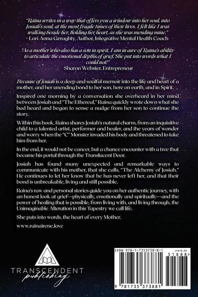 Because of Josiah is a deep and soulful memoir into the life and heart of a mother, and her unending bond to her son, here on earth, and in Spirit. Inspired one morning by a conversation she overheard in her mind between Josiah and "The Ethereal," Raina quickly wrote down what she had heard and began to sense a nudge from her son to continue the story. Within this book, Raina shares Josiah's natural charm, from an inquisitive child to a talented artist, performer and healer, and the years of wonder and worry when the "C" Monster invaded his body and threatened to take him from her. In the end, it would not be cancer, but a chance encounter with a tree that became his portal through the Translucent Door. Josiah has found many unexpected and remarkable ways to communicate with his mother, that she calls, "The Alchemy of Josiah." He continues to let her know that he has never left her, and that their bond is unbreakable, living and still possible. Raina's raw and personal stories guide you on her authentic journey, with an honest look at grief-physically, emotionally and spiritually-and the power of healing that is possible, from living with, and living through, the Unimaginable Alteration in this Tapestry we call life. She puts into words, the heart of every Mother. www.rainairene.love