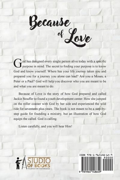 God has designed every single person alive today with a specific purpose in mind. The secret to finding your purpose is to know God and know yourself. Where has your life journey taken you and prepared you for a journey you alone can lead? Are you a Moses, a Peter or a Paul? God will help you discover who you are meant to be and what you are meant to do. Because of Love is the story of how God prepared and called Jackie Stouffer to found a youth development center. How she jumped on the roller coaster with God by her side and experienced the wild ride for seventeen plus years. The book is not meant to be a step-by- step guide for founding a ministry, but an illustration of how God equips the called. God is calling. Listen carefully, and you will hear Him!