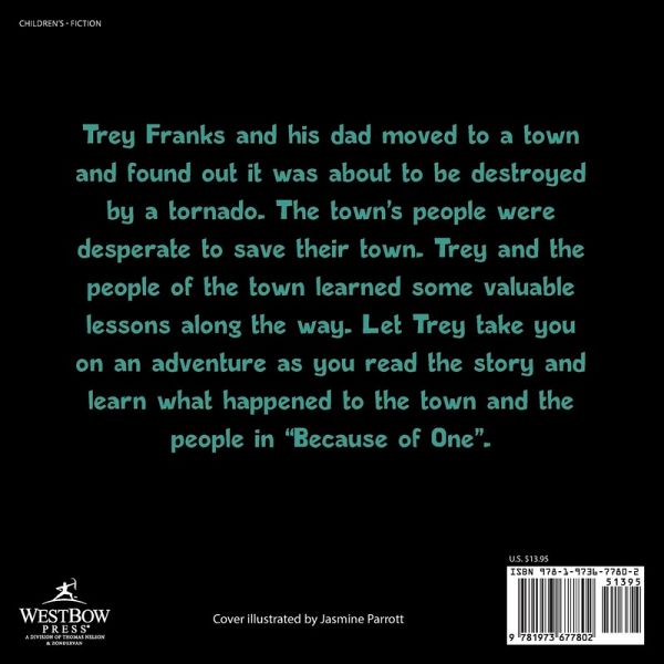Trey Franks and his dad moved to a town and found out it was about to be destroyed by a tornado. The town's people were desperate to save their town. Trey and the people of the town learned some valuable lessons along the way. Let Trey take you on an adventure as you read the story and learn what happened to the town and the people in "Because of One".