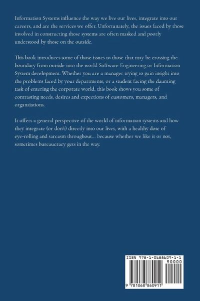 Information Systems influence the way we live our lives, integrate into our careers, and are the services we offer. Unfortunately, the issues faced by those involved in constructing those systems are often masked and poorly understood by those on the outside. This book introduces some of those issues to those that may be crossing the boundary from outside into the world Software Engineering or Information System development. Whether you are a manager trying to gain insight into the problems faced by your departments, or a student facing the daunting task of entering the corporate world, this book shows you some of contrasting needs, desires and expections of customers, managers, and organziations. It offers a general perspective of the world of information systems and how they integrate (or don't) directly into our lives, with a healthy dose of eye-rolling and sarcasm throughout... because whether we like it or not, sometimes bureaucracy gets in the way.