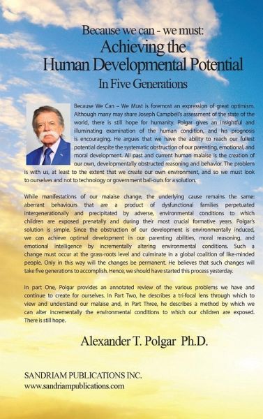 Polgar gives an insightful and illuminating examination of the human condition, and his prognosis is encouraging. We have the ability to reach out fullest potential despite the systematic obstruction of our parenting, emotional, and moral development. The underlying cause: aberrant behaviors that are a product of dysfunctional families perpetuated inter-generationally and precipitated by adverse, environmental conditions to which children are exposed prenatally and during their most crucial formative years. Polgar's solution is simple. Since the obstruction of our development is environmentally induced, we can achieve optimal development in our parenting abilities, moral reasoning and emotional intelligence by incrementally altering environmental conditions. Such a change must occur at the grass-roots level and culminate in a global coalition of like-minded people. He believes that such changes will take five generations to accomplish.