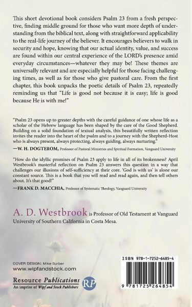This short devotional book considers Psalm 23 from a fresh perspective, finding middle ground for those who want more depth of understanding from the biblical text, along with straightforward applicability to the real-life journey of the believer. It encourages believers to walk in security and hope, knowing that our actual identity, value, and success are found within our central experience of the LORD's presence amid everyday circumstances--whatever they may be! These themes are universally relevant and are especially helpful for those facing challenging times, as well as for those who give pastoral care. From the first chapter, this book unpacks the poetic details of Psalm 23, repeatedly reminding us that ""life is good not because it is easy; life is good because He is with me!""