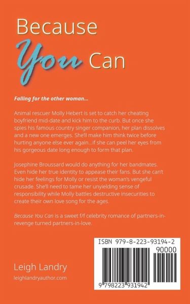 Falling for the other woman... Animal rescuer Molly Hebert is set to catch her cheating boyfriend mid-date and kick him to the curb. But once she spies his famous country singer companion, her plan dissolves and a new one emerges. She'll make him think twice before hurting anyone else ever again...if she can peel her eyes from his gorgeous date long enough to form that plan. Josephine Broussard would do anything for her bandmates. Even hide her true identity to appease their fans. But she can't hide her feelings for Molly or resist the woman's vengeful crusade. She'll need to tame her unyielding sense of responsibility while Molly battles destructive insecurities to create their own love song for the ages. Because You Can is a sweet f/f celebrity romance of partners-in-revenge turned partners-in-love.