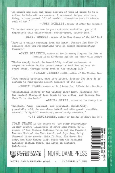 Part memoir, part handbook, part survey of the contemporary literary scene, Joan Frank's Because You Have To: A Writing Life is a collection of essays that, taken together, provide a walking tour of the writing life. Frank's aim is to form a coherent vision, one that may provide some communion about realities of the writer's vocation that have struck her as rarely revealed. Frank offers what she has learned as a writer not only to other writers, but to those to whom good writing matters. Her insights about "thinking on paper" are never dogmatic or pontifical; rather, they are cordial and intellectually welcoming. Original, witty, and practical, Frank ably steers us through the journey of her own life as a writer, as well as through the careers and work of other writers. Her subjects range widely, from the "boot camp" conditioning of marketing work to squaring off with rejection and envy; from sustaining belief in art's necessity to the baffling subjectivity of literary perception and the magical books that nourish writers. Frank's personal journey is wonderfully told, so that what in these essays is particular becomes useful and universal.