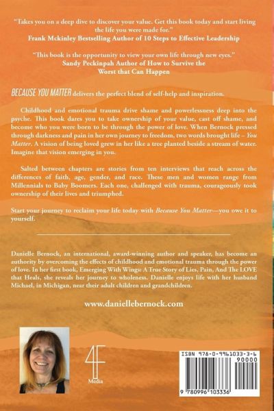 Because You Matter delivers the perfect blend of self-help and inspiration. Childhood and emotional trauma drive shame and powerlessness deep into the psyche. This book dares you to take ownership of your value, cast off shame, and become who you were born to be through the power of love. When Bernock pressed through darkness and pain in her own journey to freedom, two words brought life - You Matter. A vision of being loved grew in her like a tree planted beside a stream of water. Imagine that vision emerging in you. Salted between chapters are stories from ten interviews that reach across the differences of faith, age, gender, and race. These men and women range from Millennials to Baby Boomers. Each one, challenged with trauma, courageously took ownership of their lives and triumphed. Start your journey to reclaim your life today with Because You Matter-you owe it to yourself.