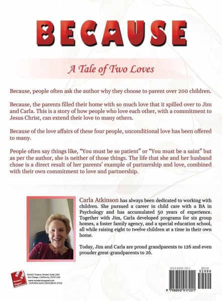 Because, people often ask the author why they choose to parent over 200 children. Because, the parents filled their home with so much love that it spilled over to Jim and Carla. This is a story of how people who love each other, with a commitment to Jesus Christ, can extend their love to many others. Because of the love affairs of these four people, unconditional love has been offered to many. People often say things like, "You must be so patient" or "You must be a saint" but as per the author, she is neither of those things. The life that she and her husband chose is a direct result of her parents' example of partnership and love, combined with their own commitment to love and partnership.