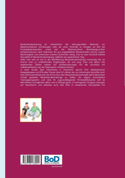 Beckenbodentraining ist unbestritten die wirkungsvollste Methode um Blasenschwäche vorzubeugen oder sie unter Kontrolle zu bringen, es hilft bei Prostatabeschwerden, sowie bei der Rekonstruktion überbeanspruchter Körperstrukturen nach Geburten. Ein gut ausgebildeter Beckenboden schützt unsere Bauchorgane und unterstützt unseren aufrechten Gang. Und für eine freudvoll erlebte Sexualität ist Beckenbodentraining vielleicht ein wesentlicher Tipp.Sieht man sich an wer in der Bevölkerung Beckenbodentraining notwendig hat, so kommt man zu verblüffenden Ergebnissen: alt und jung, Frau und Mann. Die statistischen Zahlen weisen auf Größenordnungen hin die durchaus mit Volkskrankheiten wie der Depression mithalten können.In einer Studie über Inkontinenz in Österreich spricht Prof. Madersbacher beispielsweise von 60% aller Frauen über 50 Jahren die von Inkontinenz betroffen sind.Seit 2009 beschäftigt sich die Firma Gyn Gym Beckenbodentraining© damit Menschen mittels gezielten Beckenbodentrainings zu helfen. Ein eigens entwickeltes Trainingsprogramm und eine ihr zugrundeliegende Firmenphilosophie soll es Betroffenen ermöglichen allein und in Kleingruppen, in homogenen Gruppen bezogen auf Geschlecht und teilweise auch das Alter in entspannter Atmosphäre mit Gleichgesinnten zu trainieren. Bei GynGym wird kursbegleitend auf speziellen Geräten gearbeitet, die mittels Magnetwellen den Beckenboden stärken. In den Kursen y-basic bis y-three erlernt man Schritt für Schritt zunächst seinen eigenen Beckenboden kennen und erleben. Aufbauend wird man von leichten bis zu schweren Beckenbodenübungen geleitet.Diese Übungen sollen zum Inhalt eines Buches werden, dass zum einen als Trainingsunterlage dient, zum anderen aber auch jenen Menschen die keine GynGym Kurse besuchen ein gutes Übungsrepertoire bieten. Es sind dies eigens entwickelte, neue Übungen, aber auch bereits bekannte Übungen, selektiert, überarbeitet und neu aufbereitet.
