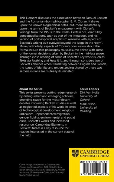 This Element discusses the association between Samuel Beckett, and the Romanian-born philosopher, E. M. Cioran. It draws upon the known biographical detail, but, more substantially, upon the terms of Beckett's engagement with Cioran's writings, from the 1950s to the 1970s. Certain of Cioran's key conceptualisations, such as that of the 'meteque', and his version of philosophical scepticism, resonate with aspects of Beckett's writing as it evolved beyond the 'siege in the room'. More particularly, aspects of Cioran's conclusion about the formal nature that philosophy must assume chime with some of the formal decisions taken by Beckett in the mid-late prose. Through close reading of some of Beckett's key works such as Texts for Nothing and How It Is, and through consideration of Beckett's choices when translating between English and French, the issues of identity and understanding shared by these two settlers in Paris are mutually illuminated.
