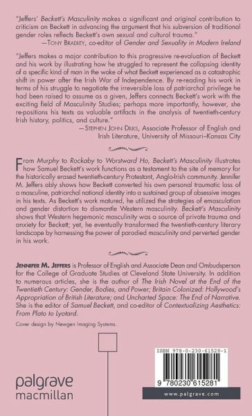 "Jeffers makes a major contribution to this progressive re-evaluation of Beckett and his work by illustrating how he struggled to represent the collapsing identity of a specific kind of man in the wake of what Beckett experienced as a catastrophic shift in power after the Irish War of Independence. By re-reading his work in terms of his struggle to negotiate the irreversible loss of patriarchal privilege he had been raised to assume as a given, Jeffers connects Beckett's work with the exciting field of Masculinity Studies; perhaps more importantly, however, she re-positions his texts as valuable artifacts in the analysis of twentieth century Irish history, politics, and culture." - Stephen John Dilks, Associate Professor of English and Irish Literature, University of Missouri-Kansas City