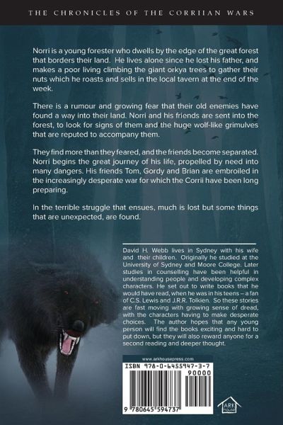 Norri is a young forester who dwells by the edge of the great forest that borders their land. He lives alone since he lost his father, and makes a poor living climbing the giant orkya trees to gather their nuts which he roasts and sells in the local tavern at the end of the week. There is a rumour and growing fear that their old enemies have found a way into their land. Norri and his friends are sent into the forest, to look for signs of them and the huge wolf-like grimulves that are reputed to accompany them. They find more than they feared, and the friends become separated. Norri begins the great journey of his life, propelled by need into many dangers. His friends Tom, Gordy and Brian are embroiled in the increasingly desperate war for which the Corrii have been long preparing.In the terrible struggle that ensues, much is lost but some things that are unexpected, are found.