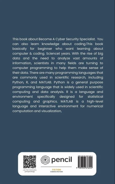 This book about Become A Cyber Security Specialist. You can also learn knowledge about coding.This book basically for beginner who want learning about computer & coding.Sciencet years. With the rise of big data and the need to analyze vast amounts of information, scientists in many fields are turning to computer programming to help them make sense of their data. There are many programming languages that are commonly used in scientific research, including Python, R, and MATLAB. Python is a generakpurpose programming language that is widely used in scientific computing and data analysis. R is a language and environment specifically designed for statistical computing and graphics. MATLAB is a high-level language and interactive environment for numerical computation and visualization,