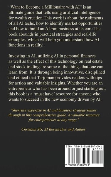 "Want to Become a Millionaire with AI" by Shervin Tarjoman is the ultimate book on artificial intelligence for building riches. The book teaches you AI technology and teaches you how to recognize market opportunities. Actually, it is a treasure chest filled with real-world examples and useful strategies to show you how AI is integrated in many areas. It talks about investing in AI, implementing personal finances with AI, and how it is revolutionizing industries like real estate and stock trading. Innovation, discipline and following ethical business practices are what Shervin Tarjoman is all about. In this book, he distills his hundreds of hours of experience into actionable tips and insights that are indispensable whether you are a seasoned entrepreneur or just starting out your journey in our AI-powered economy. This book is a must-read for everyone who wishes to excel in an AI-powered economy whether you are an experienced entrepreneur or just starting off.