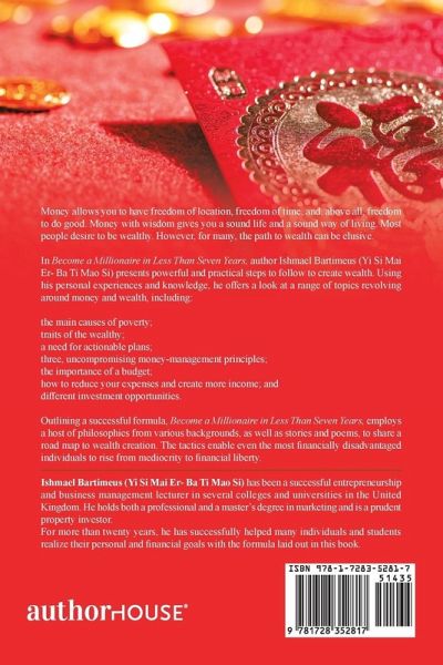 Money allows you to have freedom of location, freedom of time, and, above all, freedom to do good. Money with wisdom gives you a sound life and a sound way of living. Most people desire to be wealthy. However, for many, the path to wealth can be elusive. In Become a Millionaire in Less Than Seven Years, author Ishmael Bartimeus (Yi Si Mai Er- Ba Ti Mao Si) presents powerful and practical steps to follow to create wealth. Using his personal experiences and knowledge, he offers a look at a range of topics revolving around money and wealth, including: the main causes of poverty; traits of the wealthy; a need for actionable plans; three, uncompromising money-management principles; the importance of a budget; how to reduce your expenses and create more income; and different investment opportunities. Outlining a successful formula, Become a Millionaire in Less Than Seven Years employs a host of philosophies from various backgrounds, as well as stories and poems, to share a road map to wealth creation. The tactics enable even the most financially disadvantaged individuals to rise from mediocrity to financial liberty.