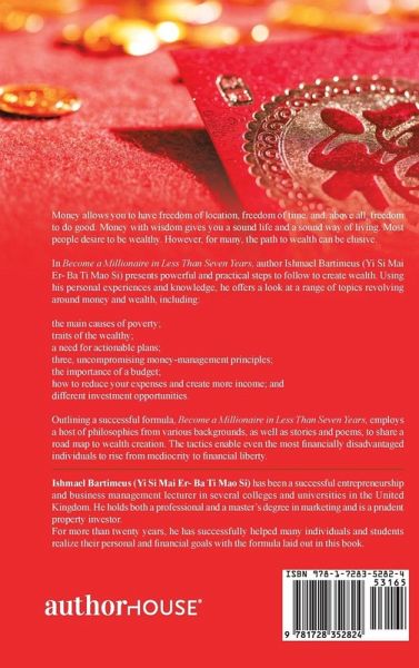 Money allows you to have freedom of location, freedom of time, and, above all, freedom to do good. Money with wisdom gives you a sound life and a sound way of living. Most people desire to be wealthy. However, for many, the path to wealth can be elusive. In Become a Millionaire in Less Than Seven Years, author Ishmael Bartimeus (Yi Si Mai Er- Ba Ti Mao Si) presents powerful and practical steps to follow to create wealth. Using his personal experiences and knowledge, he offers a look at a range of topics revolving around money and wealth, including: the main causes of poverty; traits of the wealthy; a need for actionable plans; three, uncompromising money-management principles; the importance of a budget; how to reduce your expenses and create more income; and different investment opportunities. Outlining a successful formula, Become a Millionaire in Less Than Seven Years employs a host of philosophies from various backgrounds, as well as stories and poems, to share a road map to wealth creation. The tactics enable even the most financially disadvantaged individuals to rise from mediocrity to financial liberty.