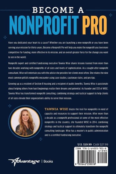 Become a Nonprofit Pro Have you dedicated your heart to a cause? Whether you are launching a new nonprofit or you have been serving your mission for thirty years, Become a Nonprofit Pro will help you make the nonprofit you love more competitive for funding, more effective in its mission, and an overall greater force for the change you want to see in the world. Nonprofit expert and Certified Fundraising Executive Tawnia Wise shares lessons learned from more than two decades working with nonprofits of all sizes and levels of sophistication. As a sought-after nonprofit consultant, Wise will entertain you with the advice she provides her clients most often. She relates the nine most common pitfalls nonprofits encounter using case studies, cautionary tales, and pro tips. Growing up as a resident of section eight housing and a recipient of public benefits, Tawnia Wise is passionate about helping others from hard beginnings realize their dreams and potential. As founder and CEO of WISE, Tawnia Wise has transformed nonprofit consulting, combining strategy and tactical support to help clients of all sizes elevate their organization's ability to serve their mission.
