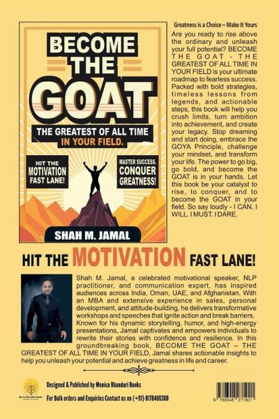Greatness is a Choice - Make It YoursAre you ready to rise above the ordinary and unleash your full potential?BECOME THE GOAT - THE GREATEST OF ALL TIME IN YOUR FIELD by Shah M. Jamal, a celebrated motivational speaker, NLP practitioner, and communication expert, is your ultimate roadmap to fearless success. Packed with bold strategies, timeless lessons from legends, and actionable steps, this book will help you crush limits, turn ambition into achievement, and create your legacy. Stop dreaming and start doing, embrace the GOYA Principle, challenge your mindset, and transform your life. The power to go big, go bold, and become the GOAT is in your hands. Let this book be your catalyst to rise, to conquer, and to become the GOAT in your field.So say loudly - I CAN. I WILL. I MUST. I DARE.