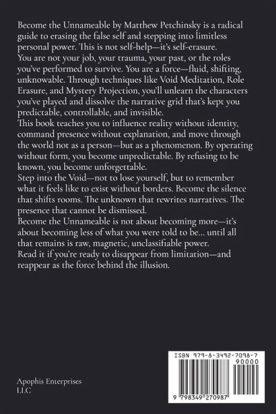 Become the Unnameable by Matthew Petchinsky is a radical guide to erasing the false self and stepping into limitless personal power. This is not self-help-it's self-erasure. You are not your job, your trauma, your past, or the roles you've performed to survive. You are a force-fluid, shifting, unknowable. Through techniques like Void Meditation, Role Erasure, and Mystery Projection, you'll unlearn the characters you've played and dissolve the narrative grid that's kept you predictable, controllable, and invisible. This book teaches you to influence reality without identity, command presence without explanation, and move through the world not as a person-but as a phenomenon. By operating without form, you become unpredictable. By refusing to be known, you become unforgettable. Step into the Void-not to lose yourself, but to remember what it feels like to exist without borders. Become the silence that shifts rooms. The unknown that rewrites narratives. The presence that cannot be dismissed. Become the Unnameable is not about becoming more-it's about becoming less of what you were told to be... until all that remains is raw, magnetic, unclassifiable power. Read it if you're ready to disappear from limitation-and reappear as the force behind the illusion.