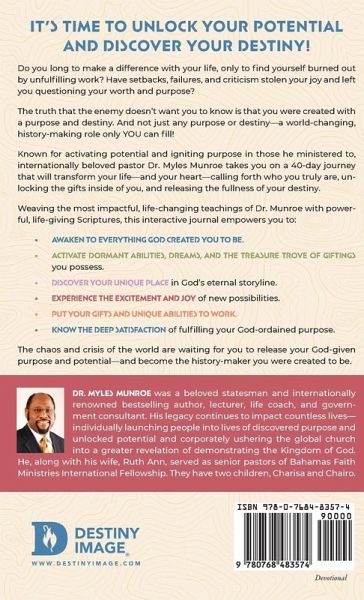 It's Time to Unlock Your Potential and Discover Your Destiny! Do you long to make a difference with your life, only to find yourself burned out by unfulfilling work? Have setbacks, failures, and criticism stolen your joy and left you questioning your worth and purpose? The truth that the enemy doesn't want you to know is that you were created with a purpose and destiny. And not just any purpose or destiny-a world-changing, history-making role only YOU can fill! Known for activating potential and igniting purpose in those he ministered to, internationally beloved pastor Dr. Myles Munroe takes you on a 40-day journey that will transform your life-and your heart-calling forth who you truly are, unlocking the gifts inside of you, and releasing the fullness of your destiny. Weaving the most impactful, life-changing teachings of Dr. Munroe with powerful, life-giving Scriptures, this interactive journal empowers you to: Awaken to everything God created you to be.Activate dormant abilities, dreams, and the treasure trove of giftings you possess. Discover your unique place in God's eternal storyline.Experience the excitement and joy of new possibilities.Put your gifts and unique abilities to work. Know the deep satisfaction of fulfilling your God-ordained purpose. The chaos and crisis of the world are waiting for you to release your God-given purpose and potential-and become the history-maker you were created to be.