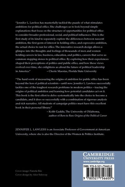'... Lawless ... has masterfully tackled the puzzle of what stimulates ambitions for political office. She challenges us to look beyond the standard explanations that center on the structure of opportunities for political office to consider broader professional, social, and political influences. This is the first study of its kind to separately explore the differences between nascent ambition, the first germ of interest in holding office, and expressive ambition, the actual choice to run for office. The innovative research design allows a glimpse into the thoughts and feelings of thousands of men and women holding careers in law, business, education, and politics, careers that serve as common stepping stones to political office. By exploring how their experiences shaped their perceptions of politics and public office, and how these views evolved over time, she enlightens us about the future of political leadership in America.' Cherie Maestas, Florida State University