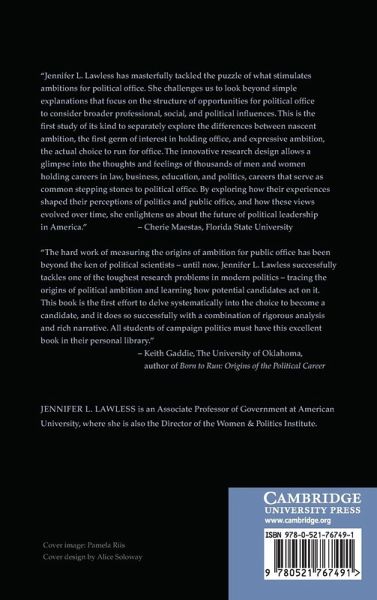 1. Mudslinging, money-grubbing, and mayhem: who would ever run for office?; 2. The decision to run for office: the theoretical and methodological approach; 3. Political ambition in the candidate eligibility pool; 4. Barack Obama and 18 million cracks in the glass ceiling: sex, race, and political ambition; 5. You could be president someday! Early socialization, the role of family, and political ambition; 6. On-the-job training: professional circumstances and the decision to run for office; 7. You think I should run for office? Political parties, political recruitment, and political ambition; 8. Biting the bullet: deciding to run for office; 9. Future patterns of candidate emergence and studies of political ambition.
