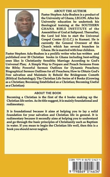 Becoming a Christian is the first of the 4 books making up the Christian life series. As its title suggest, it is mainly foundational and rudimentary.It is foundational because it aims at helping you to lay a solid foundation for your salvation and Christian life in general. It is rudimentary because it secondly aims at helping you to understand and go through the basic principles of Christianity such as Baptism in water. If you mean to begin the Christian life well, then this is a book you should never neglect.