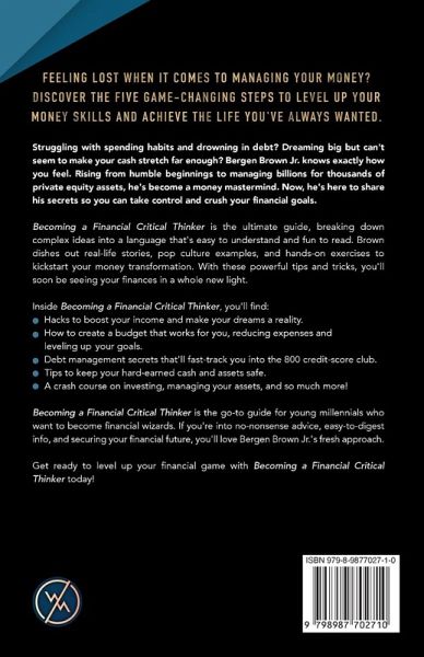Feeling lost when it comes to managing your money? Discover the five game-changing steps to level up your money skills and achieve the life you've always wanted. Struggling with spending habits and drowning in debt? Dreaming big but can't seem to make your cash stretch far enough? Bergen Brown Jr. knows exactly how you feel. Rising from humble beginnings to managing billions for thousands of private equity assets, he's become a money mastermind. Now, he's here to share his secrets so you can take control and crush your financial goals. Becoming a Financial Critical Thinker is the ultimate guide, breaking down complex ideas into a language that's easy to understand and fun to read. Brown dishes out real-life stories, pop culture examples, and hands-on exercises to kickstart your money transformation. With these powerful tips and tricks, you'll soon be seeing your finances in a whole new light. Inside Becoming a Financial Critical Thinker, you'll find:Hacks to boost your income and make your dreams a reality. How to create a budget that works for you, reducing expenses and leveling up your goals. Debt management secrets that'll fast-track you into the 800 credit-score club. Tips to keep your hard-earned cash and assets safe. A crash course on investing, managing your assets, and so much more! Becoming a Financial Critical Thinker is the go-to guide for young millennials who want to become financial wizards. If you're into no-nonsense advice, easy-to-digest info, and securing your financial future, you'll love Bergen Brown Jr.'s fresh approach. Get ready to level up your financial game with Becoming a Financial Critical Thinker today!