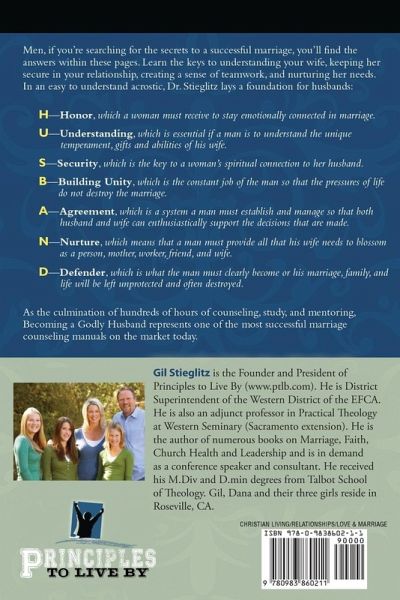 Best Seller! This best-selling book by Gil Stieglitz represents one of the most successful marriage counseling manuals on the market today. As the culmination of hundreds of hours of counseling, study, and mentoring, this book is an invaluable resource to discover the secrets to a successful marriage. The answers men seek about their wives are within these pages. This book uncovers the keys to understanding your wife, which include keeping her secure in the relationship, creating a sense of teamwork, and nurturing her needs. In an easy-to-understand acrostic, H.U.S.B.A.N.D., Dr. Stieglitz lays a foundation for what a husband needs to do to really love his wife. H = Honor U = Understanding S = Security B = Build Unity A = Agreement N = Nurture D = Defend Husbands and wives may want to go through this book and the books written for wives, God's Radical Plan for Wives by Gil and Dana Stieglitz and God's Radical Plan for Wives Companion Study Guide by Jennifer Edwards. Becoming an avid student and supporter of your spouse is necessary for a great marriage and is worth the investment.