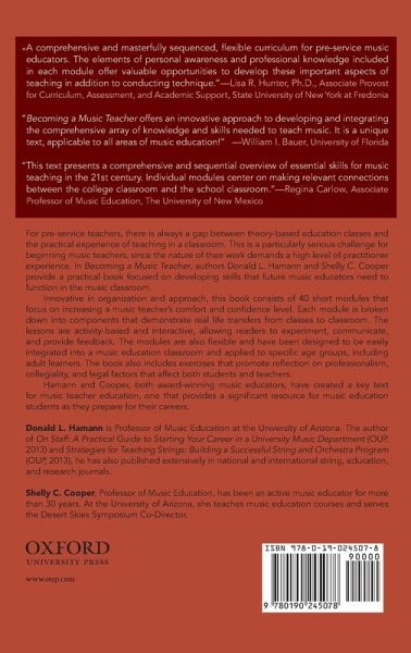 New music teachers often struggle to find a way to connect the content learned in college classes with the content that will be taught in the classroom, since the nature of their work demands a high level of both musical and educational ability, while also the skills to switch from tuning an orchestra to leading a marching band or practicing voice parts with a chorus. Becoming a Music Teacher: Student to Practitioner focuses on making the connections between the college music classroom and public school music classroom transparent, visible, and relevant. Award-winning music educators Donald L. Hamann and Shelly Cooper have created a versatile text for music teacher education, and one that will provide a significant resource for music education students across the US. Based around an innovative organization and approach, Becoming a Music Teacher is made up of 40 short modules that focus on increasing a teacher's comfort and confidence level when instructing or leading groups. Each module is broken down into four individual components that demonstrate real life transfers from classes to classroom through the components of Personal Awareness, Personal Musicianship, Pre-Conducting, and Professional Knowledge. The Personal Awareness component gives a lesson on good teaching skills by focusing on body awareness, body language, and communication styles rather than abstract theories of education. Personal Musicianship provides a guided learning approach to teaching sight-singing and opportunities to create both vocal and instrumental accompaniments with the songs that are included in the modules. Pre-conducting discusses ways in which certain gestures or concepts could be used in rehearsing a school ensemble through the development of hand/arm independence, posture, and gestures. Professional knowledge links the module to the real world and places it in the context of the workplace, offering advice on how to work with other teachers and administrators, and includes characteristics of successful teachers, the role of schools in contemporary society, and diverse learners. When taken together, these components help the student develop a genuinely rounded skill set for the classroom. The lessons are activity-based and interactive, allowing readers to experiment, communicate, and provide feedback. The modules are also flexible and have been designed to be easily integrated into a music education classroom and applied to specific age groups, includingadult learners, a demographic many music education students encounter but one rarely discussed in music education classrooms. Each module stands alone, allowing instructors to customize their lesson plans by selecting or highlighting the modules most relevant to their class. This text also includes exercises that promote reflection on professionalism, collegiality, and legal factors that affect both students and teachers, not found in most education texts.