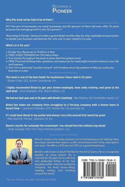 Are you struggling to get things done and take projects to a finish line? Would you like to have a customized system to make the optimal weekly sprints every week? Would you like to double your business in a year and become the only one at what you do with a proven step-by-step system? In this step-by-step uniquely written well-structured workbook, combined with detailed illustrations and video training, and filled with the right systems and tools, Bimal helps you build a customized proven path to achieving that 200% growth in one year and taking over your industry by becoming unique. In Becoming a Pioneer- Book 7, you will discover: ¿ How to make "The Optimal Weekly Sprint" Every Week?: Discover the secret pro-active weekly system that shows how to get all the things done that you need to get done. ¿ How to go from Snail Speed to Warp Speed systematically? Learn how to accelerate the speed of your day-to-day execution of projects. ¿ Discover the Five Most Common Demons in Business that you face but are unaware of and how to get rid of them. ¿ How to become "The Habitual Finisher"? Through a series of tools and questions, you will have a structure to fill the biggest gap that exists in business- getting to the finish line on all the open projects and tasks. ¿ 26 proven "leap" strategies and dozens of thinking tools to make a meaningful positive transformation in your business. ¿ Access to a proprietary system that helps you build the optimal weekly sprints for your business. You will also be able to: ¿ Build your customized takeaways at the end of every chapter. ¿ Get insights at the end given by Bimal that cater to your bottom line. Using these insights alone can double your business and help you take over your industry. ¿ Illustrations, Flowcharts, and Thinking Tools, in every chapter to deliver the right direction toward achieving great results. ¿ Use True success stories in each chapter that show you that the systems work. answer questions that help you build your own blueprint and a written action plan for each day of the week. ¿ FREE Video Training with the book to deliver 10 times more value on the content, actions, and tools provided in the book. ¿ Get access to FREE tools and resources. Becoming A Pioneer book 7 helps you double your business and become the only one in your industry by building recurring optimal weekly sprints that build and maintain the scalability of the business.. Becoming A Pioneer book series provides a master blueprint for building pioneers with organizations that will prosper long into the twenty-first century and beyond and have a timeless system that can be used repeatedly to improve growth and sustainability. Get practical guidance that converts into your own decisions and actions to build exponential growth that stands the test of time. Becoming a Pioneer turns aspiring entrepreneurs into sustainable pioneers. Don't wait. Read this book and unlock The Pioneers Platform and The Pioneers Academy today.