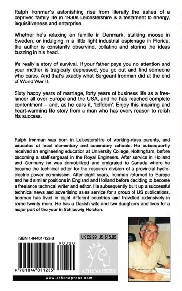 Ralph Ironman's astonishing rise from literally the ashes of a deprived family life in 1930s Leicestershire is a testament to energy, inquisitiveness and enterprise. Whether he's relaxing en famille in Denmark, stalking moose in Sweden, or indulging in a little light industrial espionage in Florida, the author is constantly observing, collating and storing the ideas buzzing in his head. It's really a story of survival. If your father pays you no attention and your mother is tragically depressed, you go out and find someone who cares. And that's exactly what Sergeant Ironman did at the end of World War II. Sixty happy years of marriage, forty years of business life as a free-lancer all over Europe and the USA, and he has reached complete contentment - and, as he calls it, 'toffdom'. Enjoy this inspiring and heart-warming life story from a man who has every reason to relish his success. Ralph Ironman was born in Leicestershire of working-class parents, and educated at local elementary and secondary schools. He subsequently received an engineering education at University College, Nottingham, before becoming a staff-sergeant in the Royal Engineers. After service in Holland and Germany he was demobilized and emigrated to Canada where he became the technical editor for the research division of a provincial hydro-electric power commission. After eight years, Ironman returned to Europe and held similar positions in England and Holland before deciding to become a freelance technical writer and editor. He subsequently built up a successful technical news and advertising sales service for a group of US publications. Ironman has lived in eight different countries and travelled extensively in some twenty more. He has a Danish wife and two daughters and lives for a major part of the year in Schleswig-Holstein.
